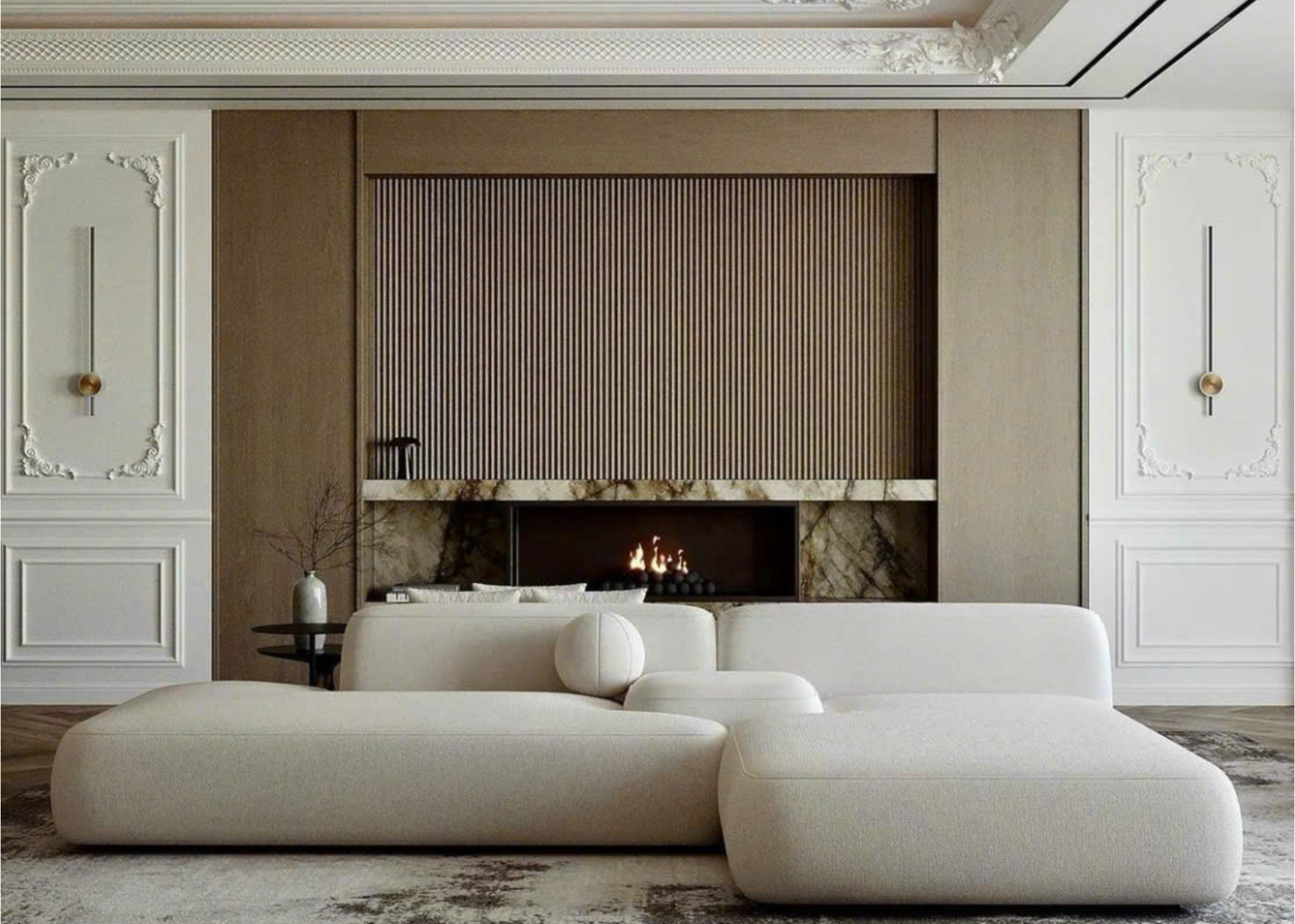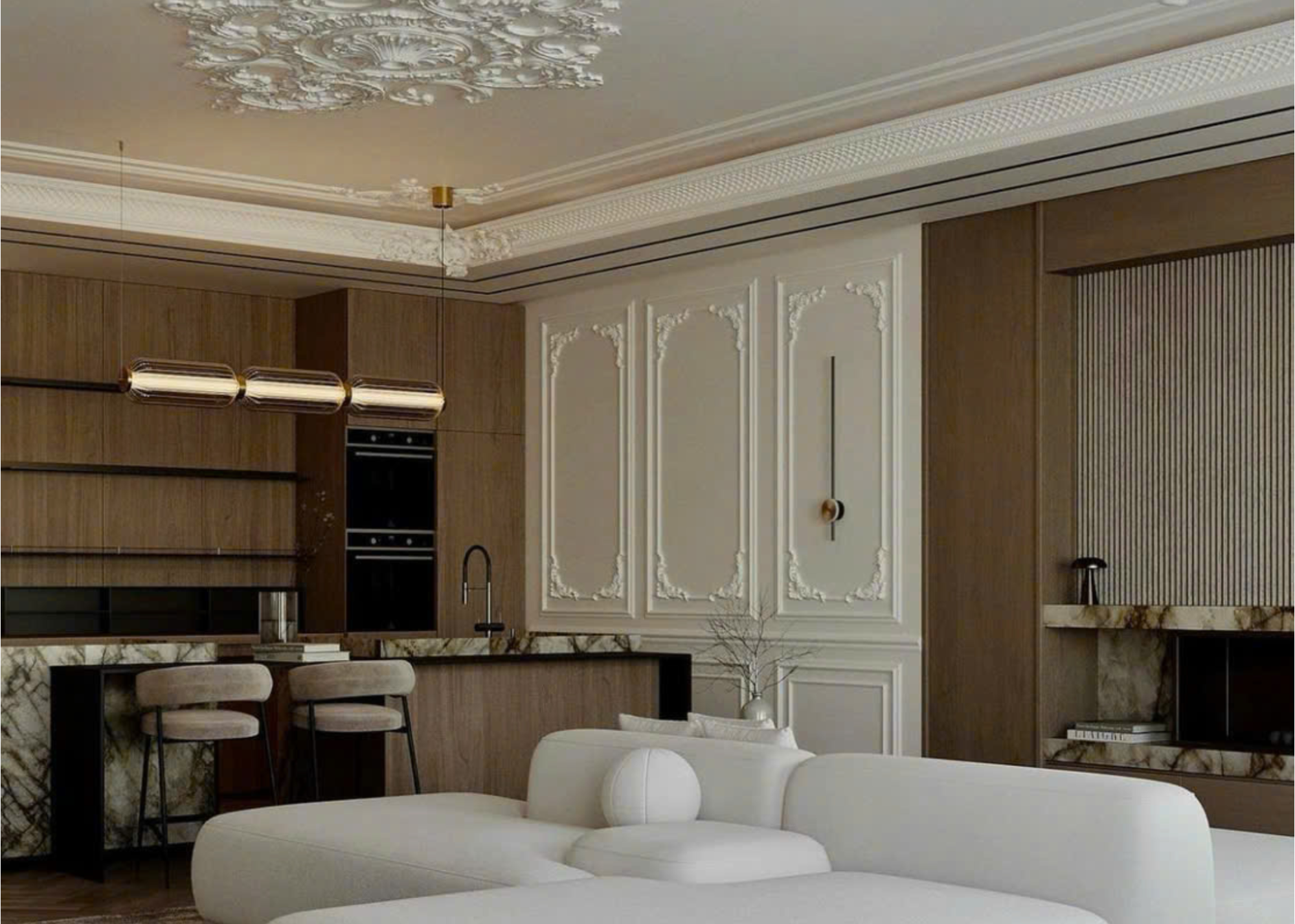 Khi kết hợp cùng vật liệu hiện đại như đá vân mây, gỗ tự nhiên hay kim loại ánh kim, phào chỉ không tạo cảm giác đối lập mà hòa nhập, giúp bề mặt không gian có chiều sâu và nhịp điệu. Nhờ đó, không gian sống sẽ trở nên trang trọng mà không nặng nề, vừa hiện đại vừa tinh tế, giữ được sự cân bằng giữa ấm áp và sang trọng. Có thể nói, phào chỉ trong Modern Classic chính là “sợi chỉ vô hình” giúp kết nối giữa các yếu tố tưởng chừng trái ngược: cổ điển và đương đại, cầu kỳ và tối giản, truyền thống và sáng tạo.